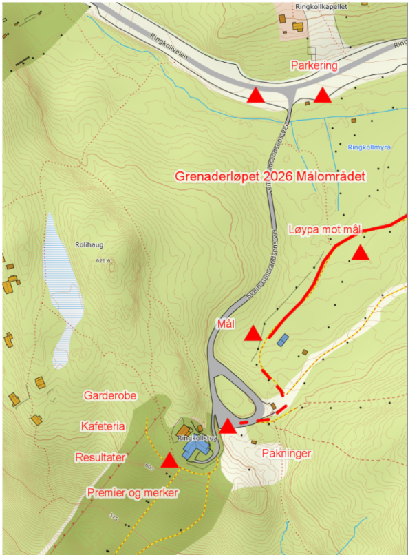 Mål er på Ringkollen i 2026. Her deles bagasjen ut som er levert ved start. Ringkollstua er det garderober, kiosk og premieutdeling.